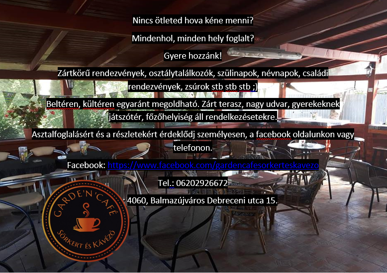 Nyáron kerthelyiségünkben fedett terasz gondoskodik azokról, akik a jó levegőn szeretnek helyet foglalni, Télen zárt és meghitt hangulat. Zártkörű rendezvények, családi rendezvények megtartására is alkalmas.